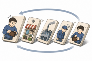ここまでの記事では、政府支出が「注入」として経済循環を動かし、その一方で貯蓄が「漏れ」として経済循環を弱めることを見てきました。漏れが小さければ経済は大きく広がり、漏れが大きければ広がりにくくなります
