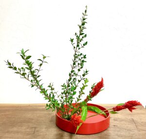 草月流は3流派の中でも最も自由で創作性の高い流派と言われています。ただ、実際に指導を受けてみると、決まった「型」というのを最初に教わることになります。なるほど、適当に生けているわけではないんだなと、ここで初めて知ります(笑)