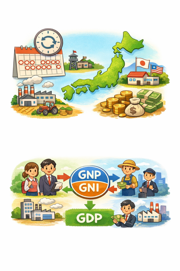 ①「1年間」→国内の経済活動の集計期間(経済指標の作成期間)