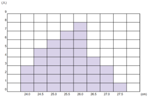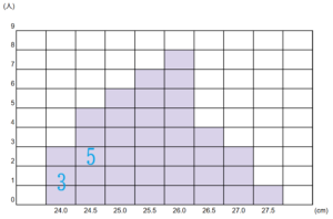 最頻値は「度数が最も多いデータ」のことを言います。そうすると、ヒストラムだとひと目で分かります。度数が1番多いところはもう見ただけで分かるので、最頻値は26.0cmということになります。
