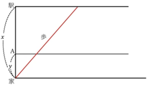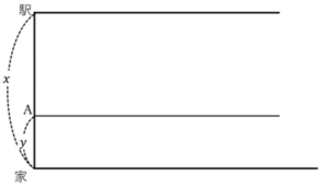 このように、家から駅までが\(x\)m、その途中に\(A\)点があって、\(y\)mがあります。で、横軸、書いてないですがこれは時間を表します。このような図を考えます。
