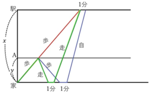 もしも、A地点から歩いて家まで引き返し、忘れ物を取って自転車に乗って駅に向かうと、いつもより駅への到着時刻が1分遅くなる。A地点から走って家に引き返し、忘れ物を取ってそのまま走って駅へ向かうと、いつもと同じ時刻に駅に到着できる。ただし、川崎君の歩く速度は毎分80m、走る速度は毎分160m、自転車の速度は毎分200mで、家に到着してから忘れ物を取って再度出発するまでに1分かかるものとする。家から駅までの距離を\(x\)m、家からA地点までの距離を\(y\)mとするとき、次の問に答えなさい。 (1) 川崎君が家から駅まであるいたときにかかる時間を、\(x\)を用いて表しなさい。 (2) 連立方程式をつくり、\(x\)、\(y\)の値を求めなさい。 |