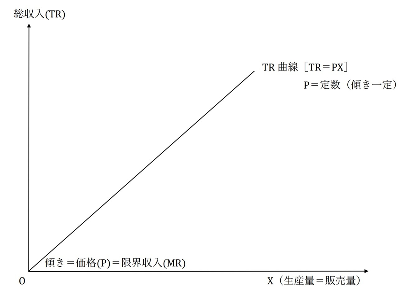 です。価格(P)が定数(たとえば100円)なのでグラフは右上がりの直線になります。経済学では直線も曲線と呼びます。TR直線といわずにTR曲線としています。