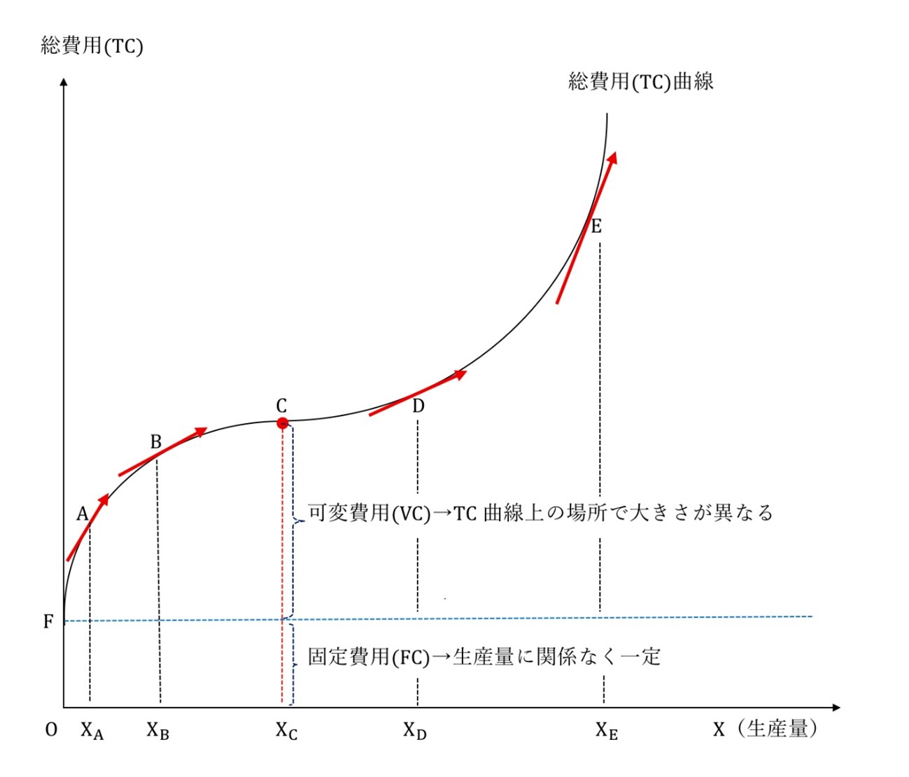 「可変費用(VC)」は増加の仕方は一定ではなく、生産量に応じて変化します。赤色の矢印の傾きに注目してください。赤色の矢印は「総費用(TC)曲線の接線」として引いています。「接線の傾き=限界費用(MC)=追加費用」という関係を思い出してください。