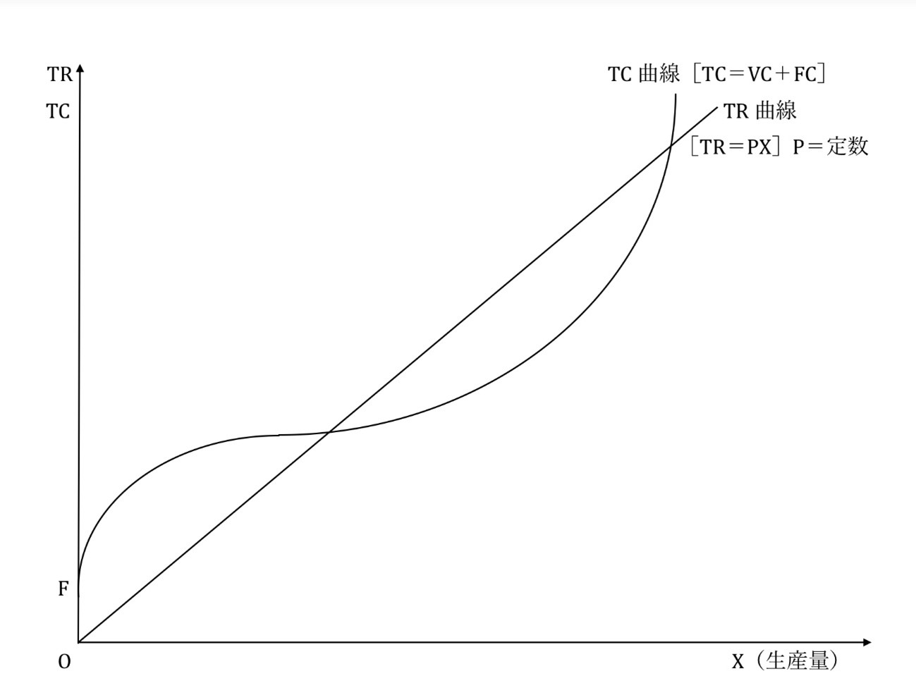 次にFを起点とする「可変費用(VC)」をみていきます。「可変費用(VC)」は生産量がゼロのときは発生額がゼロですが、生産量が大きくなるほど増加します。その結果、「可変費用(VC)」に「固定費用(FC)」を加えた「総費用(TC)」も増加します。つまり「総費用(TC)曲線」の形は「可変費用(VC)」の変化の仕方によって決まるのです。