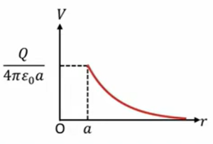 \(E \ = \ \frac{Q}{4πε_0r^2} \ (r \ > \ a) \ \ \ \ \ V \ = \ – \displaystyle \int_{∞}^{r} Edr \ = \ \frac{Q}{4πε_0r}\)