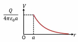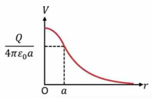 \(V \ = \ V(a) \ – \displaystyle \int_{a}^{r} \ Edr \ = \ \frac{Q}{4πε_0a}\)