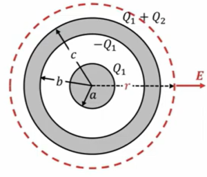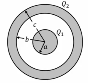半径\(a\)の導体球を内半径\(b\)、外半径\(c(a \ < \ b \ < \ c)\)の導体球殻で包み、内球に\(Q_1\)、外球に\(Q_2\)の電荷を与えた場合の電場と内球、外球の電位を求めよ。