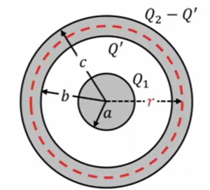 ここにありますように、半径\(a\)の導体球と、内半径\(b\)、外半径\(c\)の導体球、これが同心円球状に2つ並んでます。