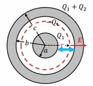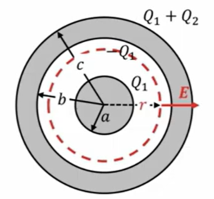 なのでまとめますと、\(Q\)の外側での電場の大きさは\(E \ = \ \frac{Q_1 \ + \ Q_2}{4πε_0r}\)です。で、外側の灰色や中心部分の灰色のところは導体内なので電場は0です。