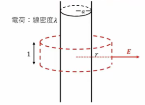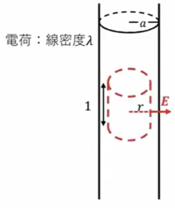 この電場の大きさですが、下図の破線で書いた部分に「ガウスの法則」を早速適用します。