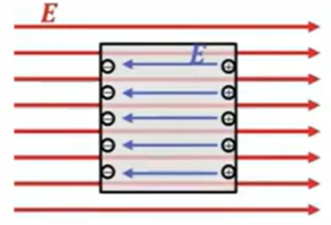 そうすると、その動いた電子が電場と逆方向の電場を作るのでこれが電場が0になったところで落ち着いてしまう。