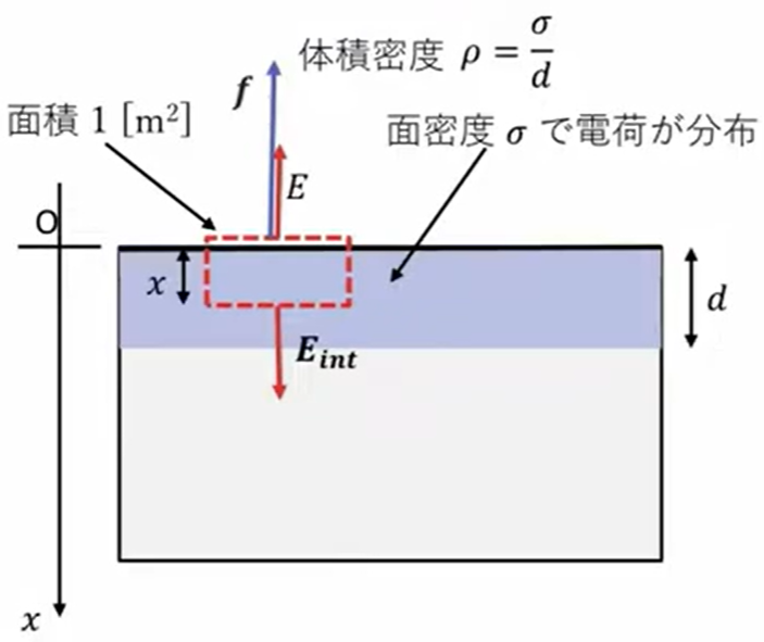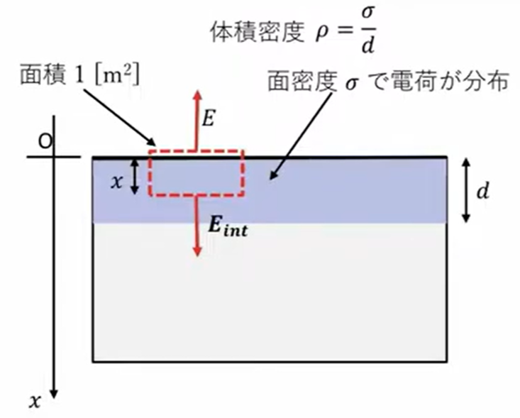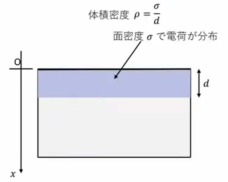 そうすると、面密度を\(σ\)だとすると、厚さ\(d\)で体積密度に換算すると、体積密度は\(\frac{σ}{d}\)と、図のように水色で書いてある領域に電荷が均等に分布してるっていうことを仮定します。