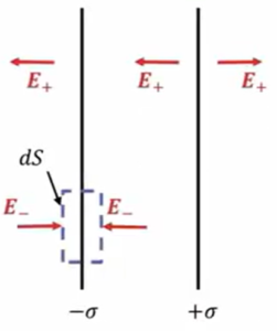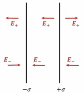 中間で \(E \ = \ E_+ \ + \ E_- \  = \ \frac{σ}{ε_0}\)